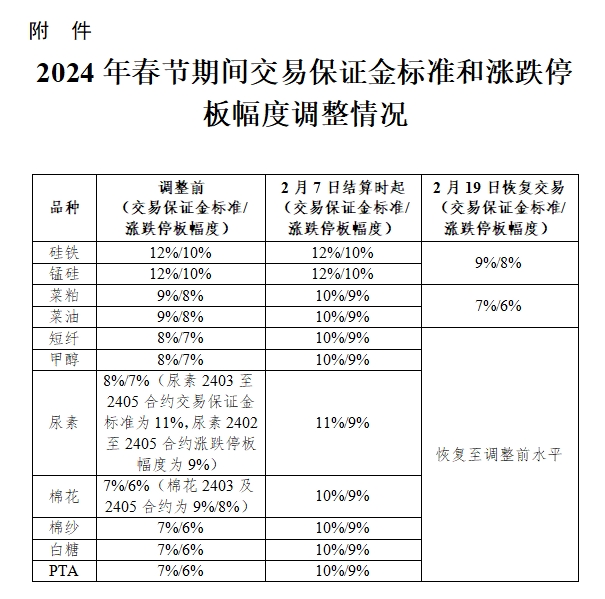 一、自2024年2月7日结算时起,白糖、棉花、棉纱、菜粕、菜油、PTA、短纤和甲醇期货合约的交易保证金标准为10%,涨跌停板幅度为9%;尿素期货合约的交易保证金标准为11%,涨跌停板幅度为9%。