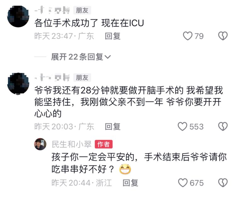 1月23日,评论区的一条留言引起了民生的注意。留言说,“爷爷,我还有28分钟就要做开脑手术,我希望能坚持住。我刚做父亲不到一年,爷爷你要开开心心的。”看到留言后,民生一边回复,一边通过私信联系到网友。两人聊天记录显示,要做手术的男子今年24岁,因为家里困难有了放弃治疗的想法。于是,民生把自己拍视频赚的710块钱都转给了男子,并一直和男子聊天,鼓励他好好治疗。钱被退回后,民生说:“好心疼他,但我真的没办法,他不肯收我的钱。”说这话时,民生声音哽咽。